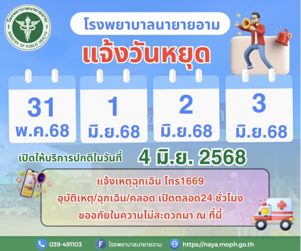 ประกาศโรงพยาบาลนายายอาม แจ้งวันหยุด ในวันที่ 31 พฤษภาคม ถึงวันที่ 3 มิถุนายน พ.ศ.2568 เปิดให้บริการปกติในวันที่ 4 มิถุนายน พ.ศ.2568 แจ้งเหตุฉุกเฉิน โทร1669 อุบัติเหตุ/ฉุกเฉิน/คลอด เปิดตลอด24 ชั่วโมง ขออภัยในความไม่สะดวกมา ณ ที่นี้