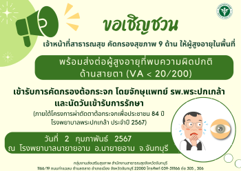 ขอเชิญชวนผู้สูงอายุและประชาชนทั่วไป ที่มีความผิดปกติด้านสายตาเข้ารับการตรวจคัดกรอง ตาต้อกระจก เนื่องจากโอกาสครบรอบ 84ปี