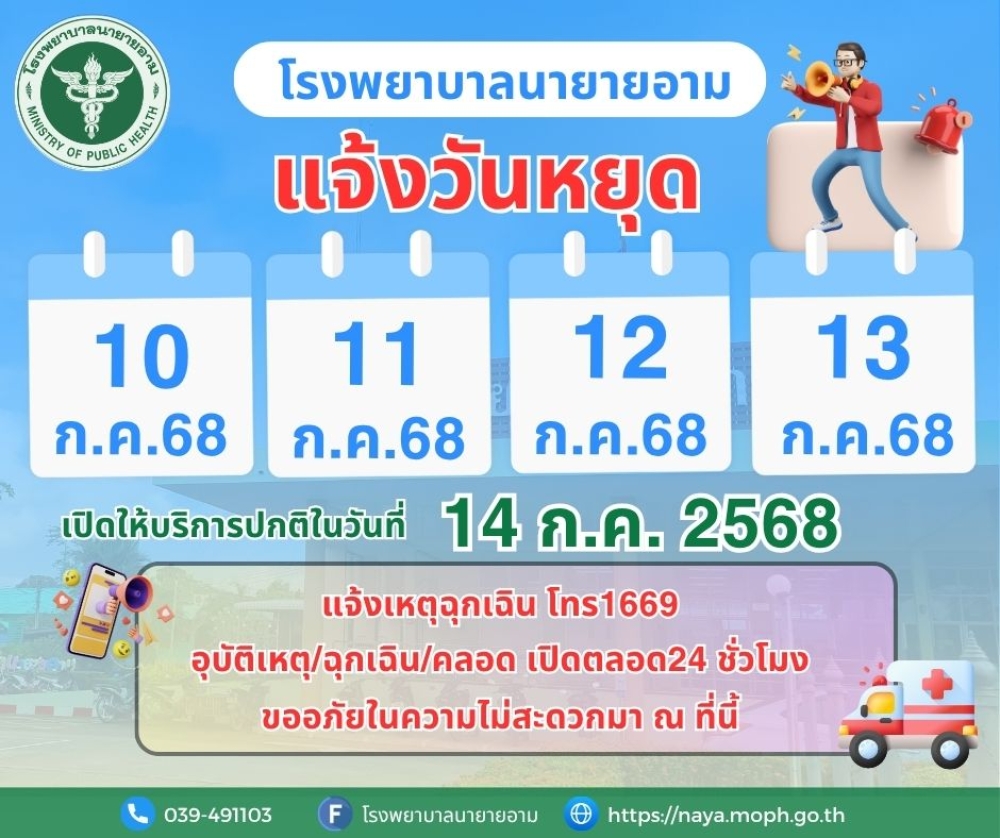 ประกาศโรงพยาบาลนายายอาม แจ้งวันหยุด ในวันที่ 10 กรกฎาคม ถึงวันที่ 13 กรกฎาคม พ.ศ.2568 เปิดให้บริการปกติในวันที่ 14 กรกฎาคม พ.ศ.2568 แจ้งเหตุฉุกเฉิน โทร1669 อุบัติเหตุ/ฉุกเฉิน/คลอด เปิดตลอด24 ชั่วโมง ขออภัยในความไม่สะดวกมา ณ ที่นี้