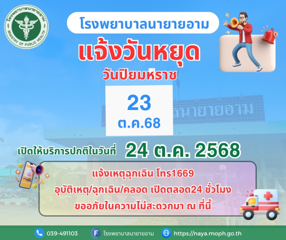 ประกาศโรงพยาบาลนายายอาม แจ้งวันหยุด ในวันที่ 23 ตุลาคม พ.ศ.2568 เปิดให้บริการปกติในวันที่ 24 ตุลาคม พ.ศ.2568