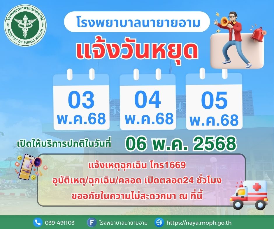 ประกาศโรงพยาบาลนายายอาม แจ้งวันหยุด ในวันที่ 3 - 5 พฤษภาคม พ.ศ.2568 เปิดให้บริการปกติในวันที่ 6 พฤษภาคม พ.ศ.2568 แจ้งเหตุฉุกเฉิน โทร1669 อุบัติเหตุ/ฉุกเฉิน/คลอด เปิดตลอด24 ชั่วโมง ขออภัยในความไม่สะดวกมา ณ ที่นี้