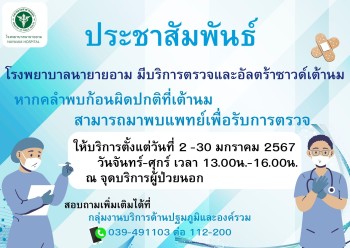 ประชาสัมพันธ์ โรงพยาบาลนายายอาม มีบริการตรวจและอัลตร้าซาวด์เต้านม หากคลำพบก้อนผิดปกติที่เต้านม สามารถมาพบแพทย์เพื่อรับการตรวจ