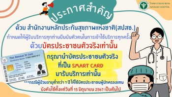 ประกาศโรงพยาบาลนายายอาม เรียนผู้มารับบริการทุกท่าน เพื่อยืนยันตัวตนผู้มารับบริการ กรุณานำบัตรประชาชนตัวจริงที่เป็น SMART CARD มารับบริการเท่านั้น บังคับใช้ตั้งแต่วันที่ 15 มิถุนายน 2567 เป็นต้นไป