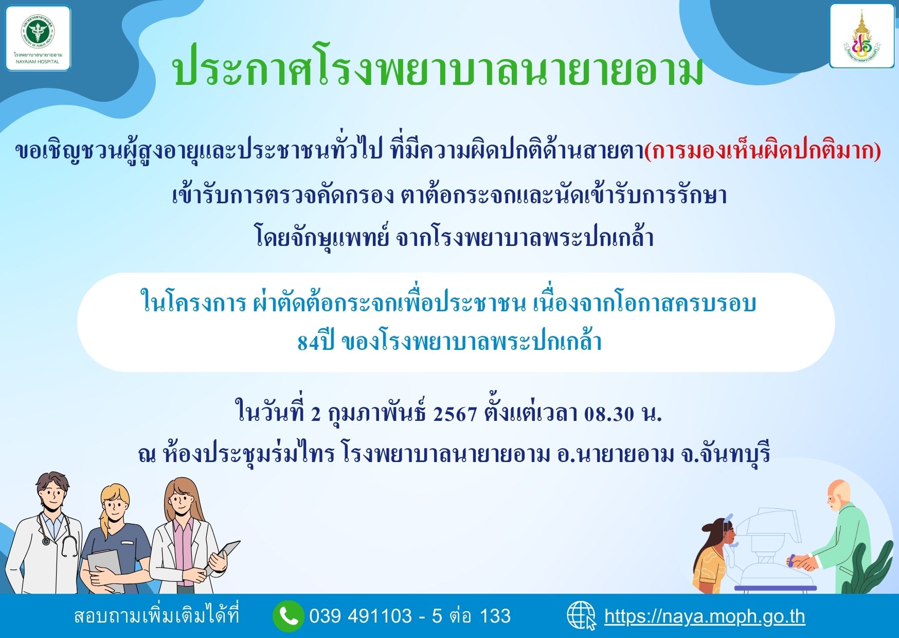 ขอเชิญชวนผู้สูงอายุและประชาชนทั่วไป ที่มีความผิดปกติด้านสายตาเข้ารับการตรวจคัดกรอง ตาต้อกระจก เนื่องจากโอกาสครบรอบ 84ปี