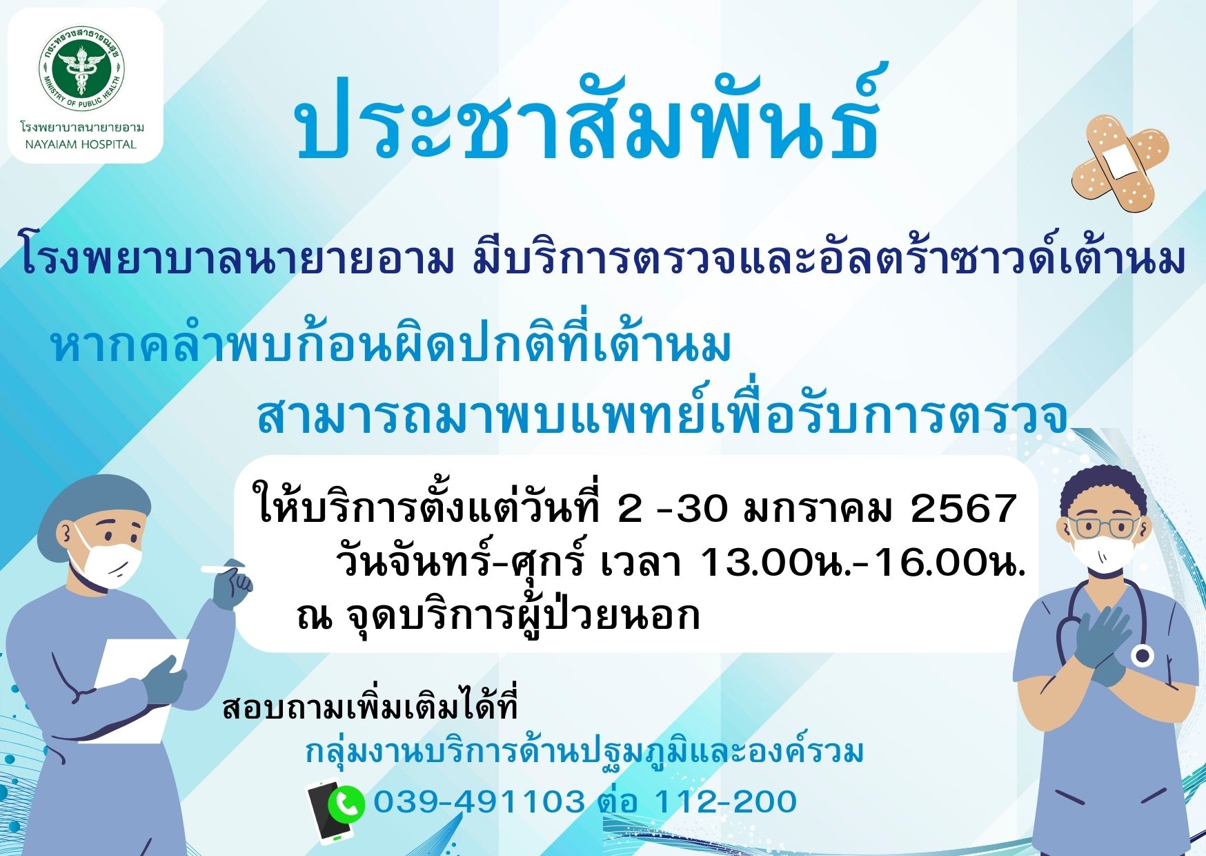 ประชาสัมพันธ์ โรงพยาบาลนายายอาม มีบริการตรวจและอัลตร้าซาวด์เต้านม หากคลำพบก้อนผิดปกติที่เต้านม สามารถมาพบแพทย์เพื่อรับการตรวจ